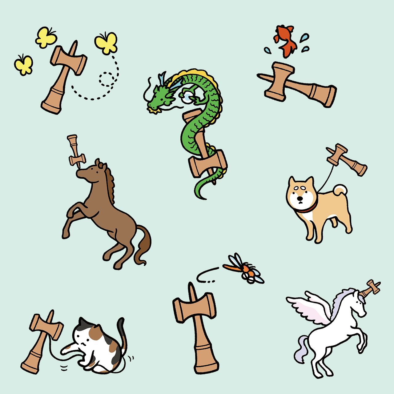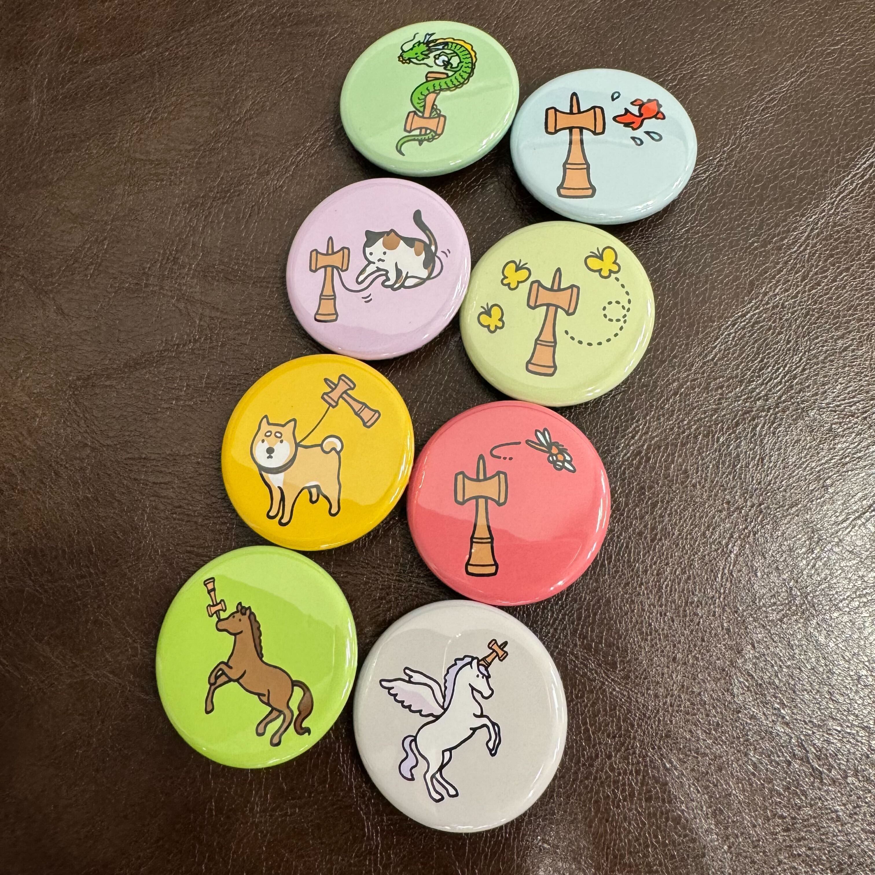 生き物の名前がついたけん玉トリックをモチーフにしたイラスト缶バッジ8個セットです。